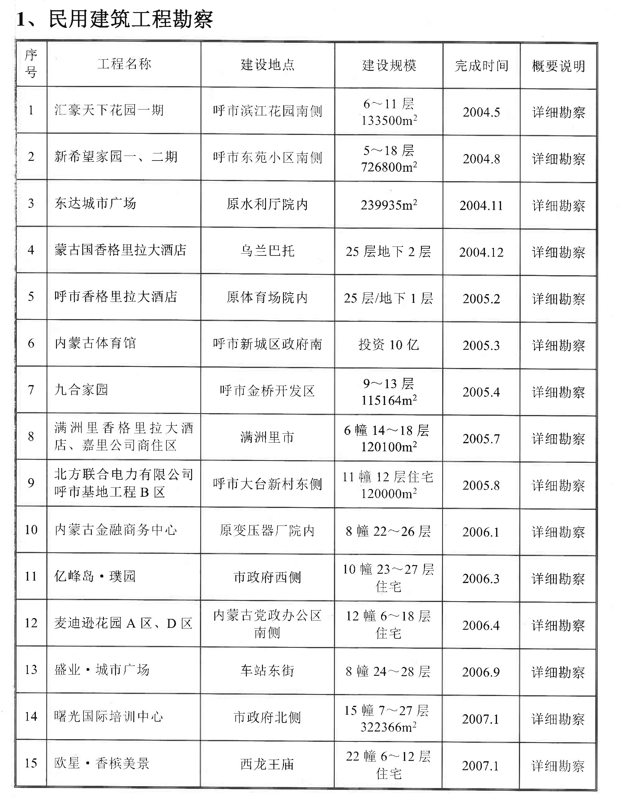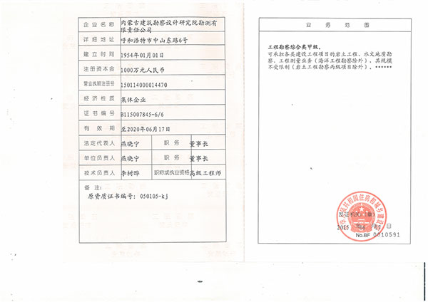 - 內蒙古建筑勘察設計研究院勘測有限責任公司,是全國首家完成 轉企建制的省級建筑勘察設計單位。公司前身為內蒙古建筑勘察 設計研究院勘測分院, 成立于1954年 ,經過六十多年的發展, 現已成為全區技術力量雄厚、專業設置齊全的集巖土工程勘察 、 設計、治理、檢測、監理、咨詢、水文地質勘查、工程測量、科 研為一體的綜合性企業 ... ... [查看詳情]